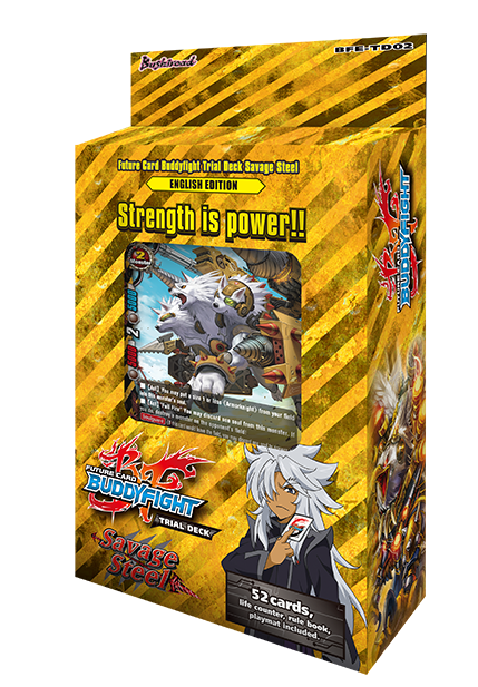 A fearsome rival, Rouga Aragami, joins the battle with his [Savage Steel] Trial Deck! Ride together with the ironclad monster knights of <Danger World> into battle! This pre-constructed Trial Deck features the same deck that Rouga uses in the animation and comes with everything new players need to enjoy the game with their buddies!